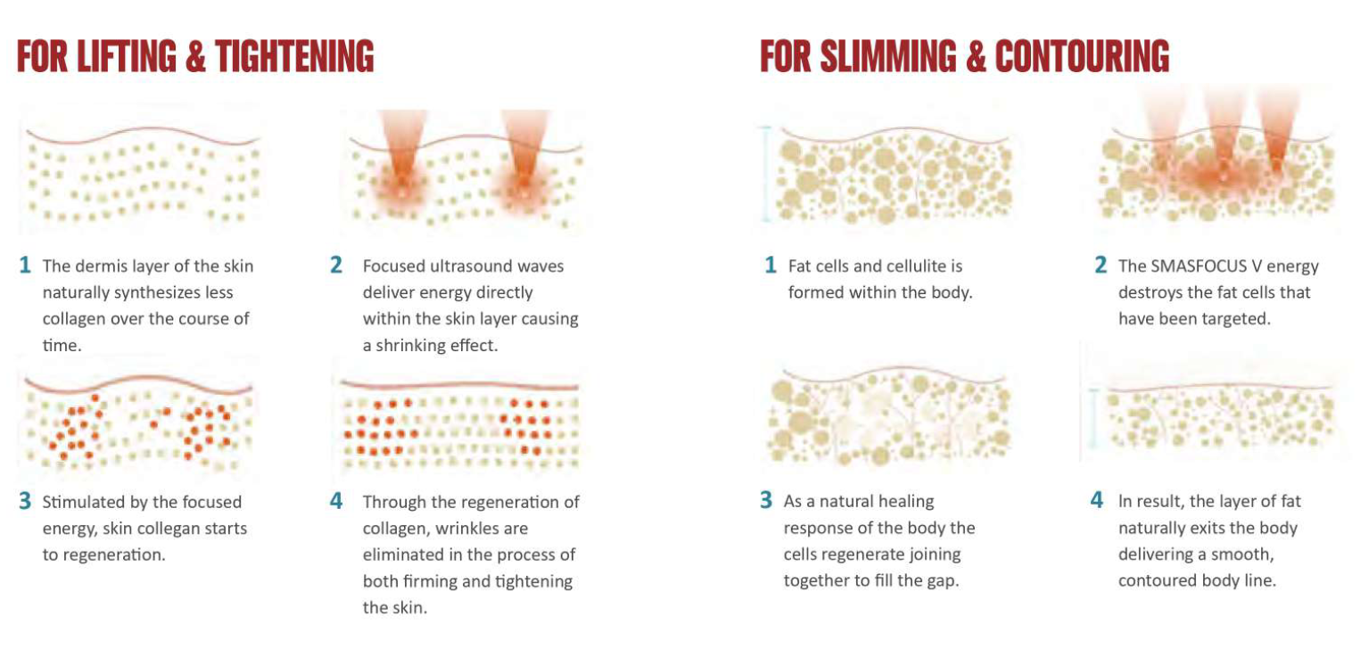 Transferring stabilized temperatures of 65~75°C into the targeted zones, the SMASFOCUS V aims to induce a process of neocollagenesis in the face while tightening body tissues for contouring purposes.